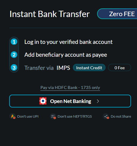 Step 4: Understanding Instant Bank Transfer With Instant Bank Transfer: A nominal fee of 0.1% per transaction is applied. Only IMPS is supported (avoid RTGS, NEFT, or UPI to prevent issues).