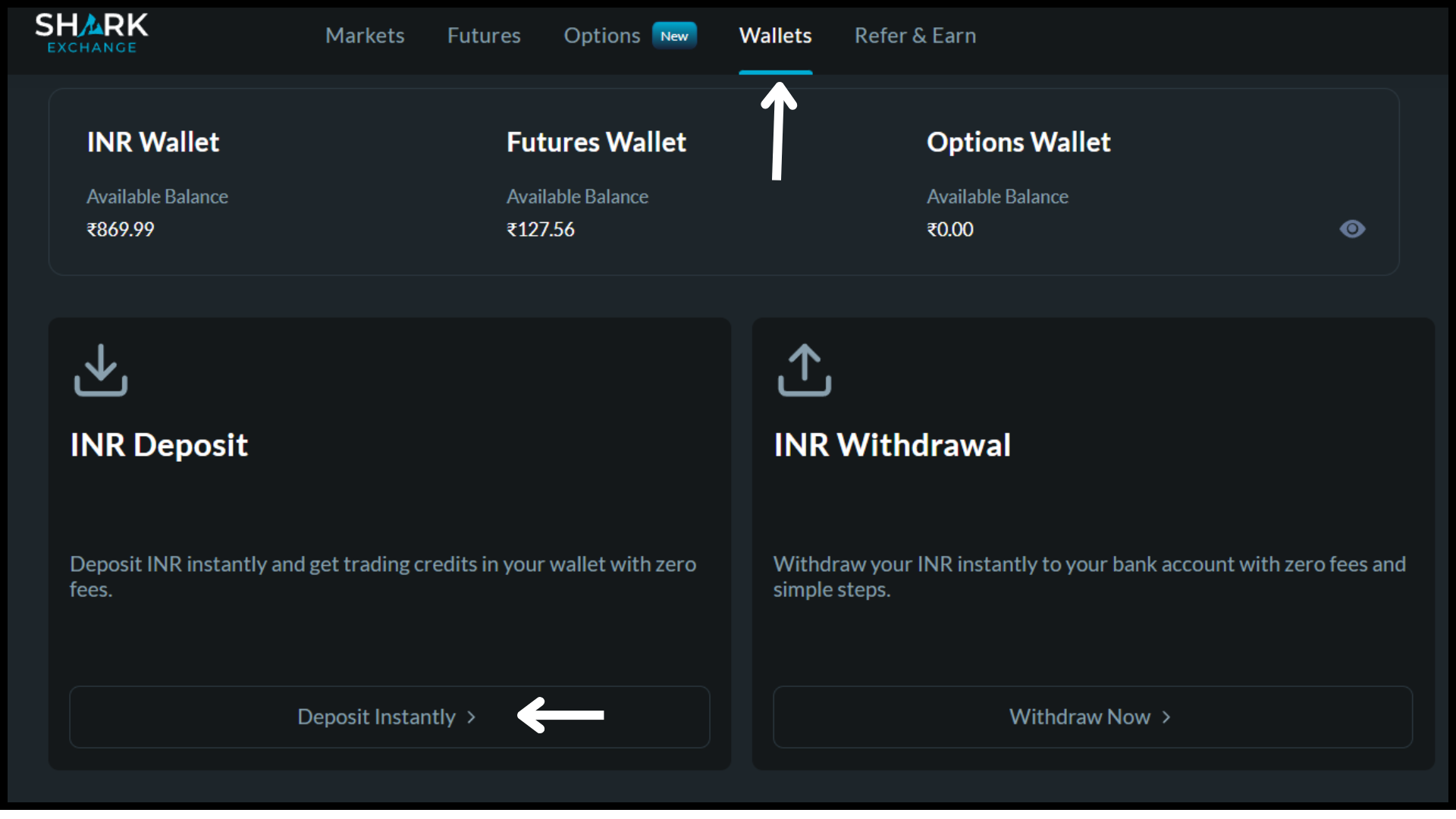 Step 2: Initiating Deposit : Open the Shark Exchange app and navigate to the 'Wallets' page. Click on ' INR "INR wallet" followed by "INR Deposit" to start the deposit process