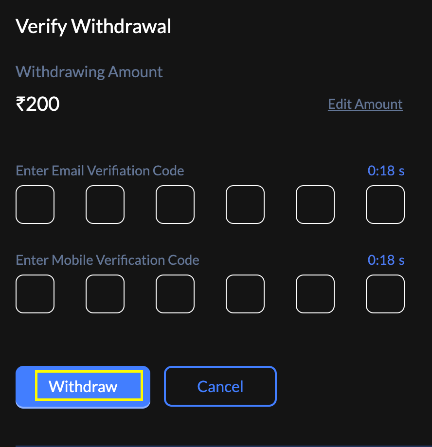 Step 5 : Once you click on Yes Enter the OTP's you received on the registered mail ID and phone number and click on withdraw.