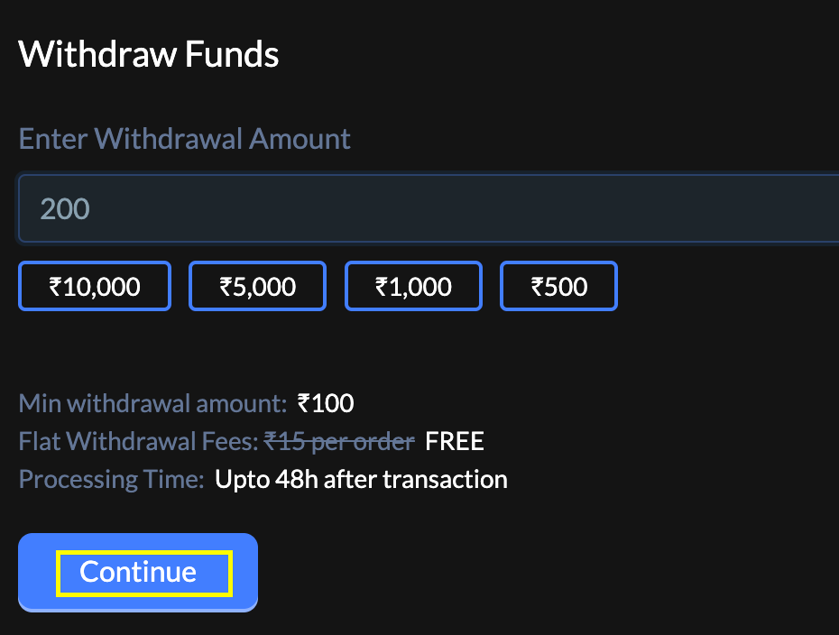 Step 3: Enter the amount that you wish to withdraw and click on continue