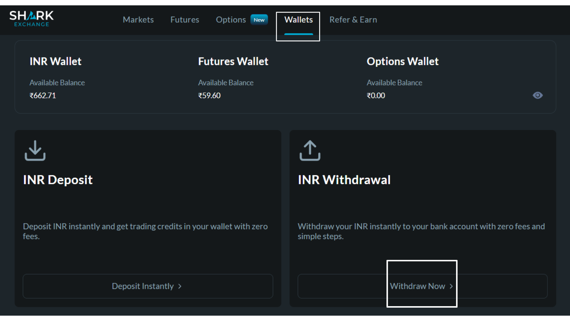 Note: Before requesting a withdrawal, ensure that the funds you wish to withdraw are available in your INR wallet. If your funds are currently in the Futures wallet, kindly transfer the desired amount to your INR wallet before proceeding with the withdrawal.