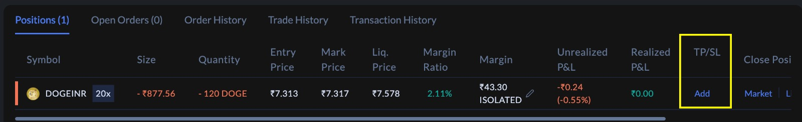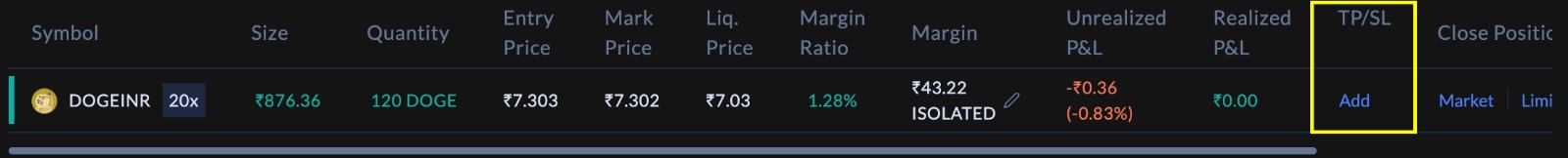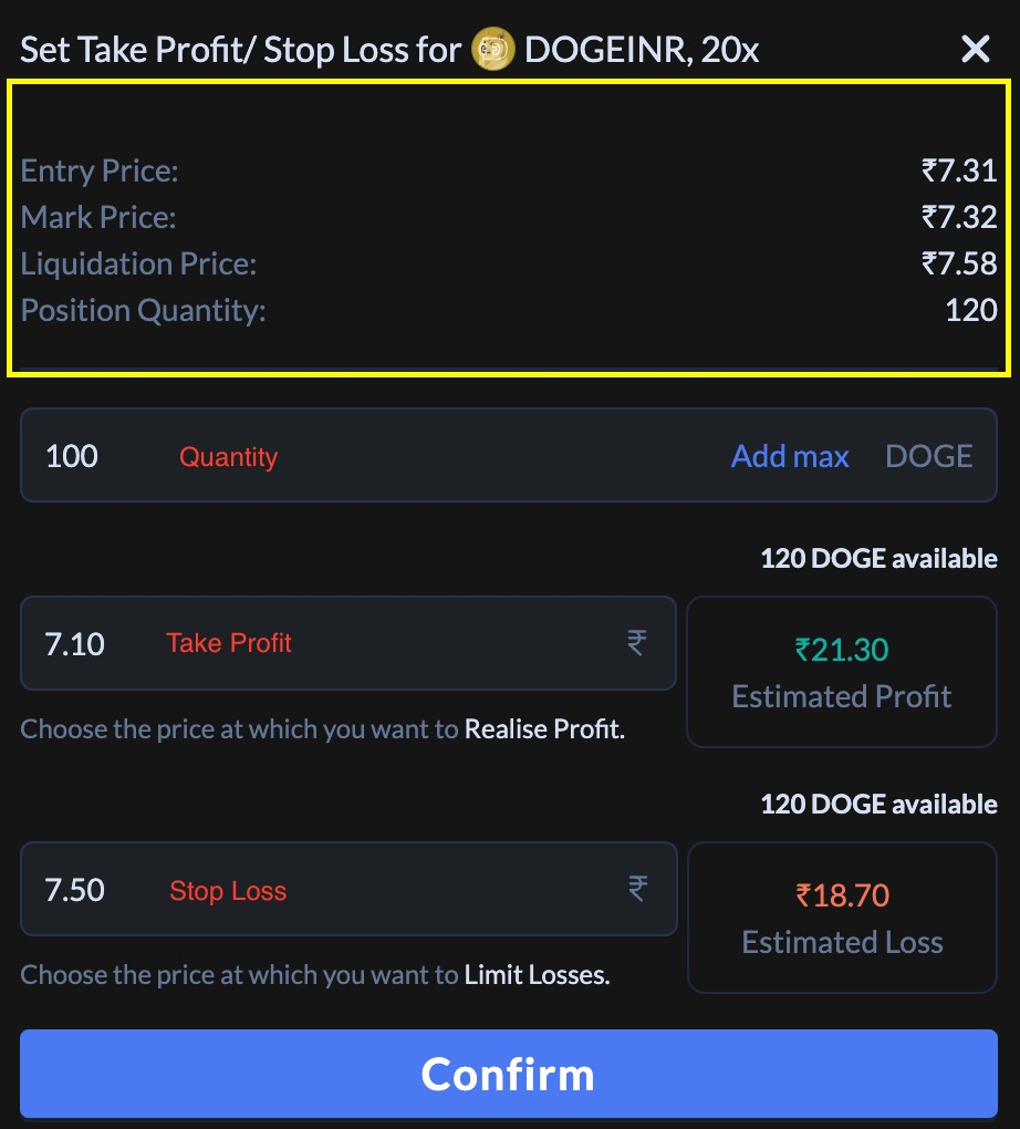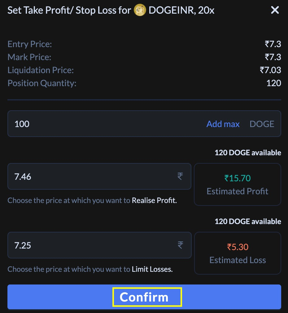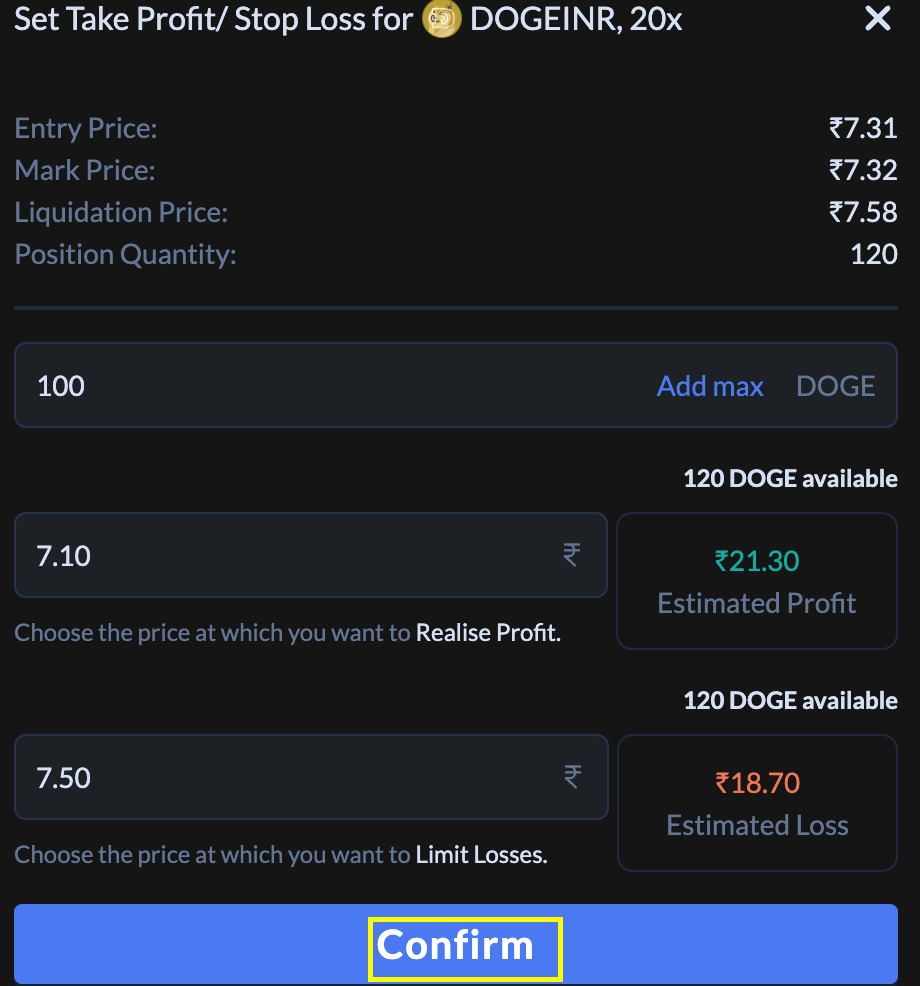 Example: If you have a short position of 120 Doge coin with a Mark Price of ₹7.31 and a Liquidation Price of ₹7.57