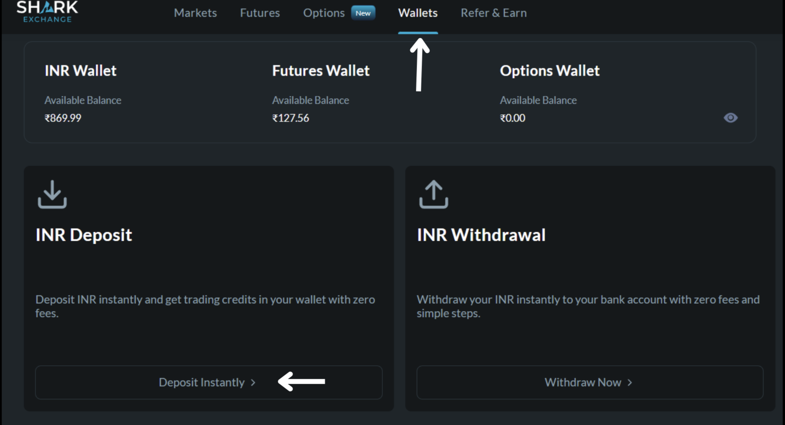 Step 2: Initiate Deposit: After logging in, go to the “Wallets” section on the dashboard.Click on “Deposit INR.”
