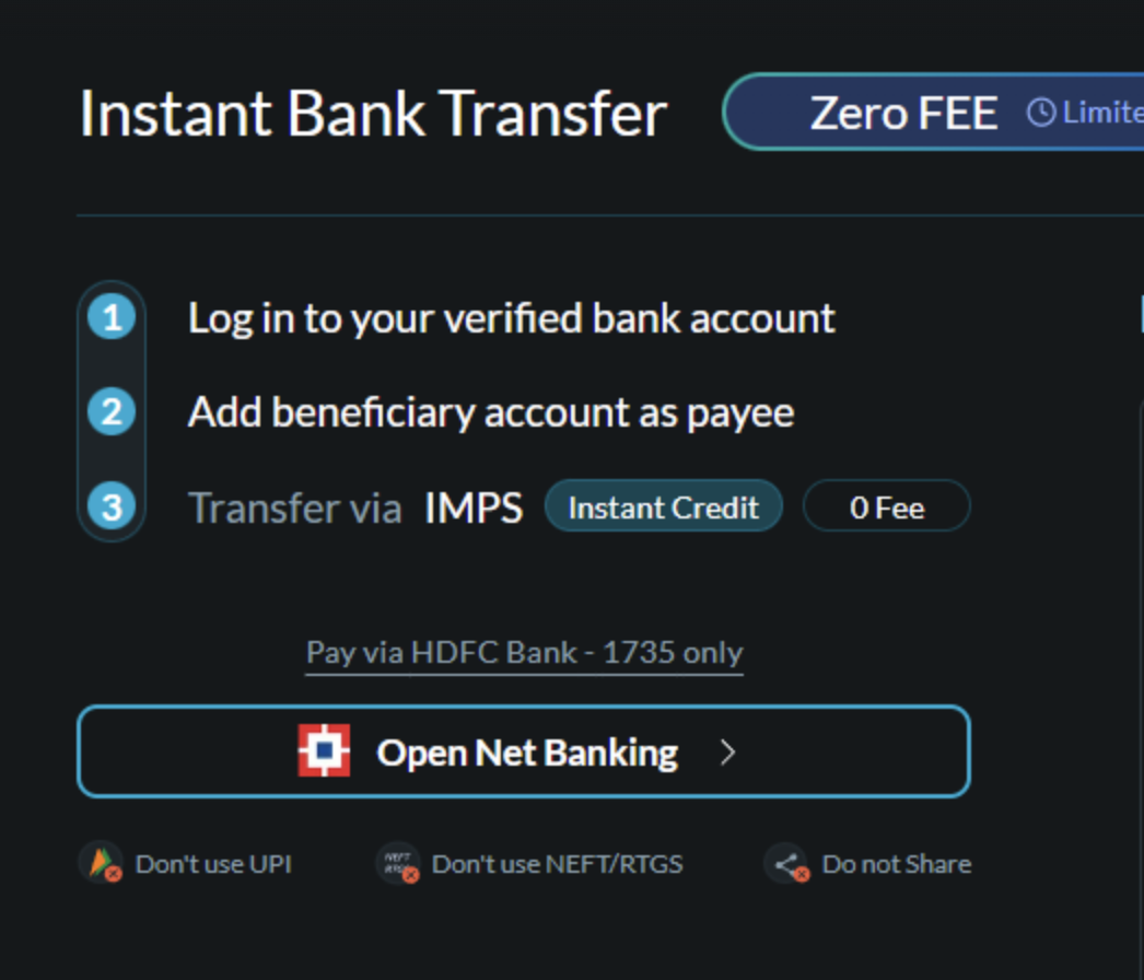 Step 4: Understanding Instant Bank Transfer With Instant Bank Transfer: A nominal fee of 0.1% per transaction is applied. Only IMPS is supported (avoid NEFT, or UPI to prevent issues).