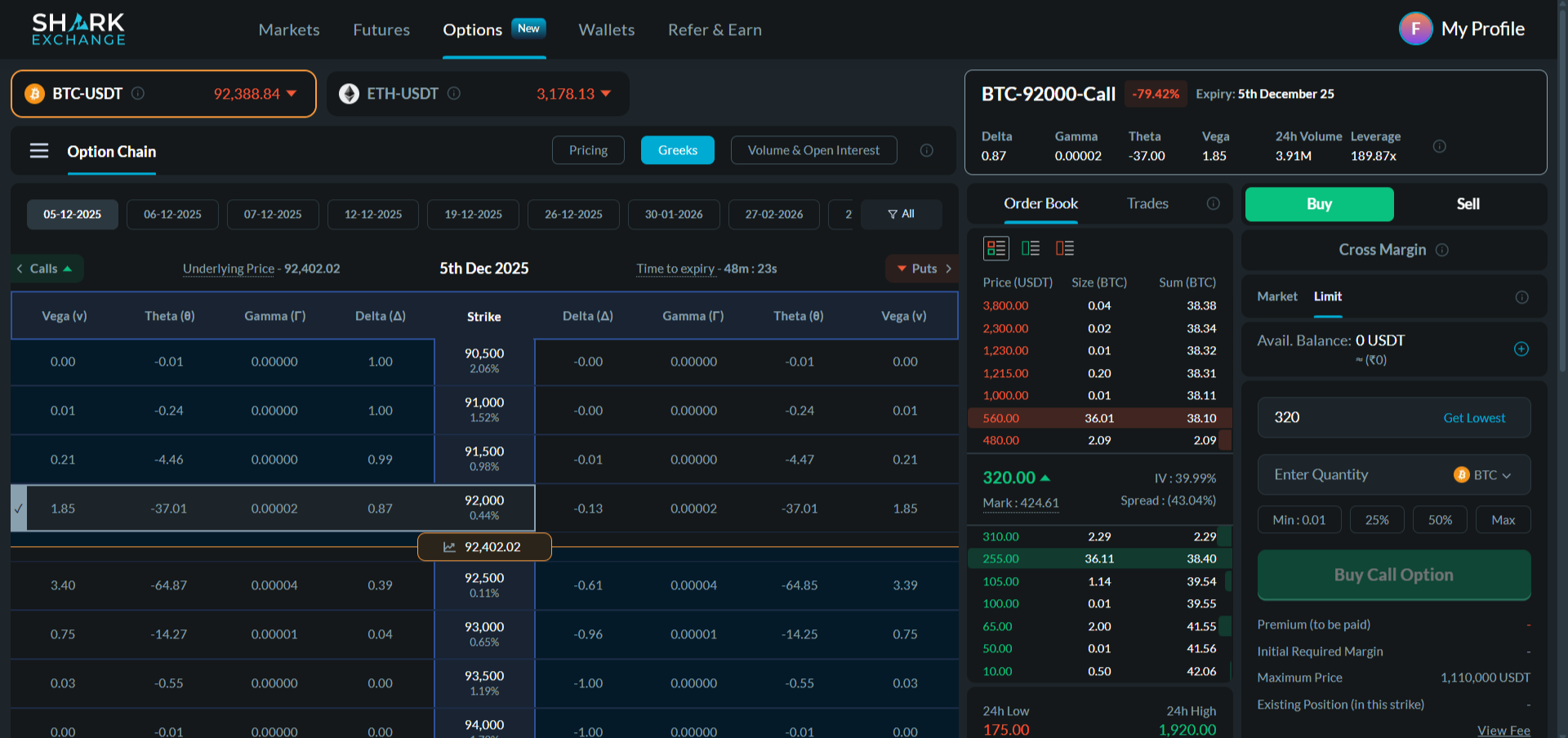 You can see the Greeks Tab on the Option Chain page. This tab shows the Greeks values for each option strike. The left column is for call options, and the right column is for put options.